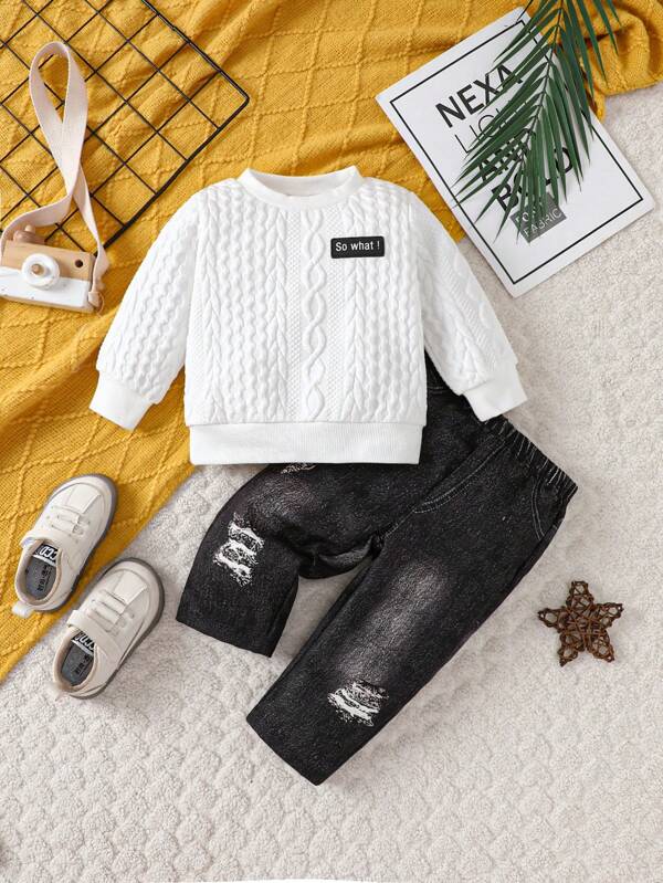 Baby Boys' Patch Detail Shirt & Denim Printed Pants Outfits