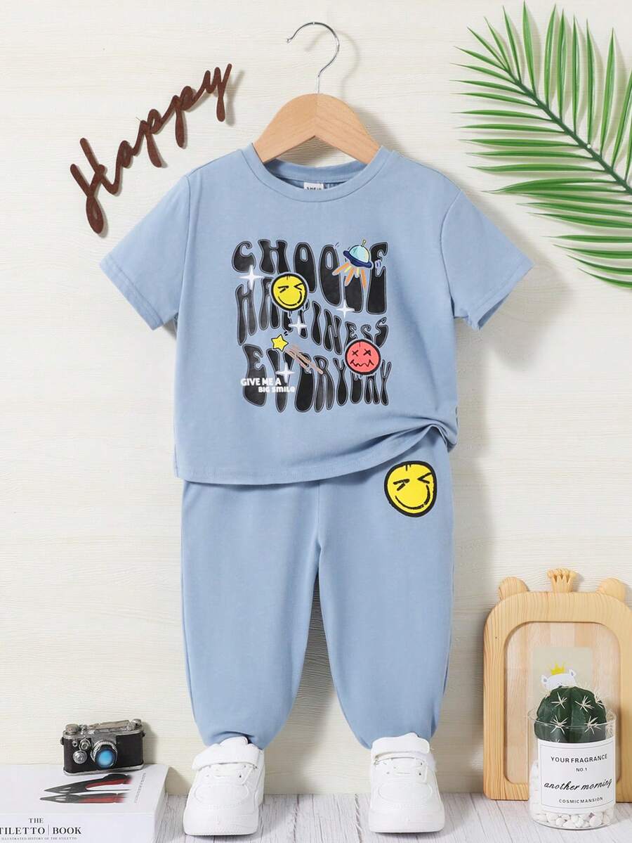 SHEIN Baby Boys' Round Neck Short Sleeve Expression & Letter Printed T-Shirt And Long Pants Set