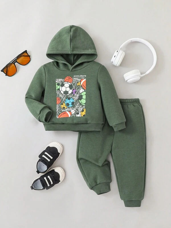 SHEIN Baby Boys' Soccer Pattern Hooded Sweatshirt And Elastic Waist Pants Set