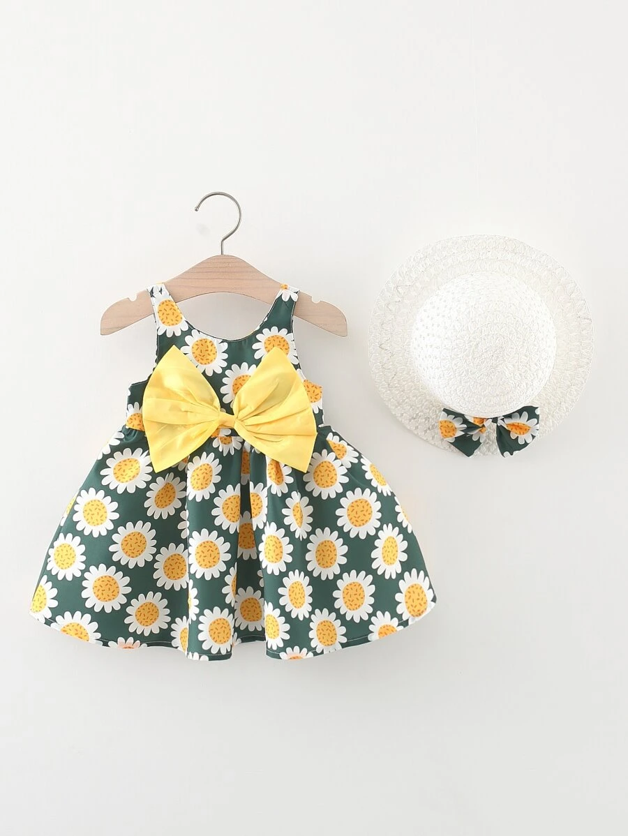 Baby Floral Print Bow Front Dress & Accessory Hat