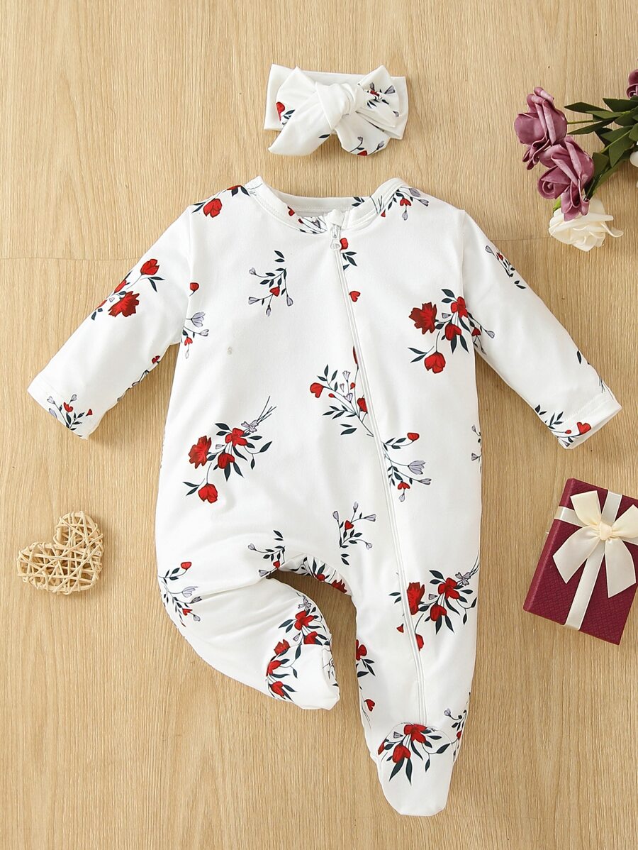 Baby Floral Print Footed Sleepsuit With Headband