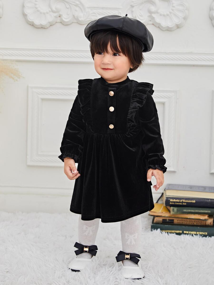 SHEIN Baby Girl Flounce Sleeve Ruffle Trim Velvet Dress