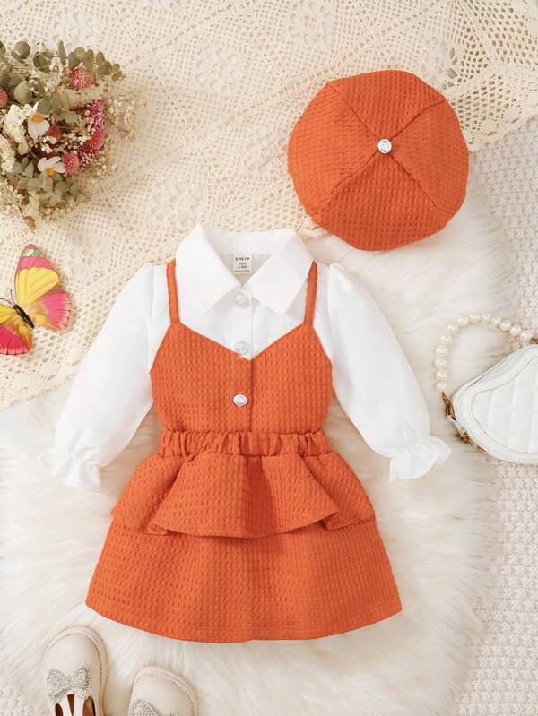 Baby Girl' Elegant Blouse And Skirt Set With Hat, Suitable For Party In Autumn