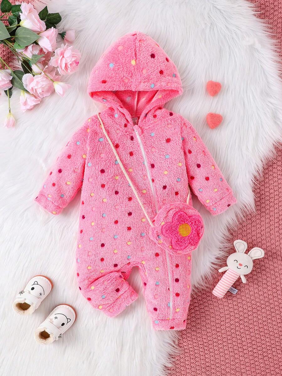 Baby Girl's Polka Dot Furry Hooded Jumpsuit Fashionable Thickened Autumn And Winter Warm Style