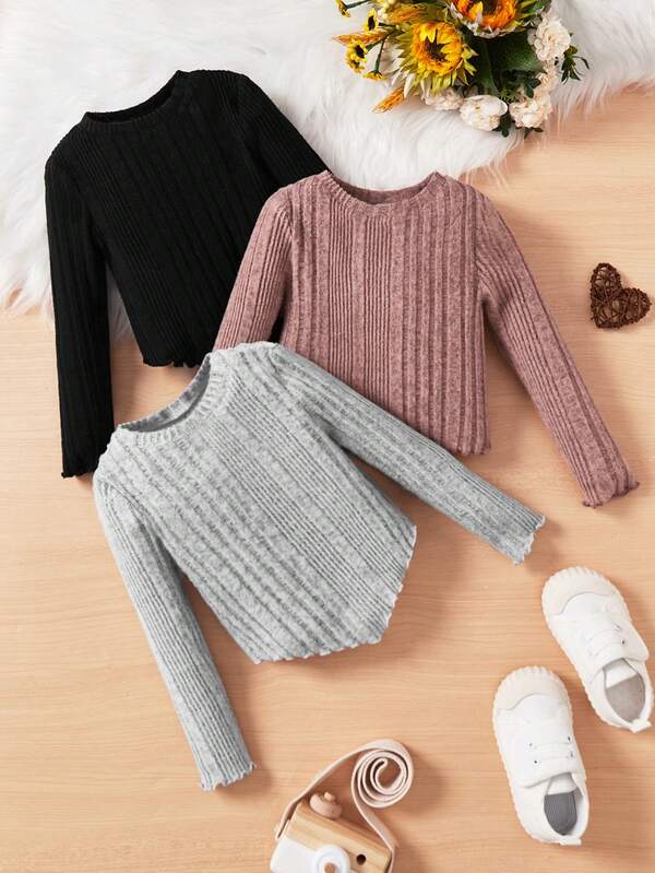 SHEIN Baby Girl 3pcs Lettuce Trim Ribbed Knit Tee