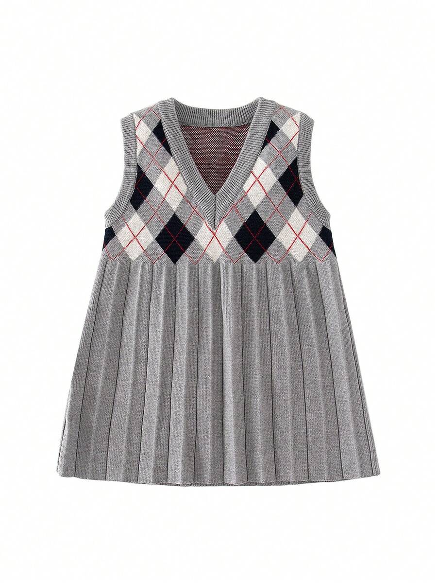 Baby Girl Argyle Pattern Pleated Sweater Dress