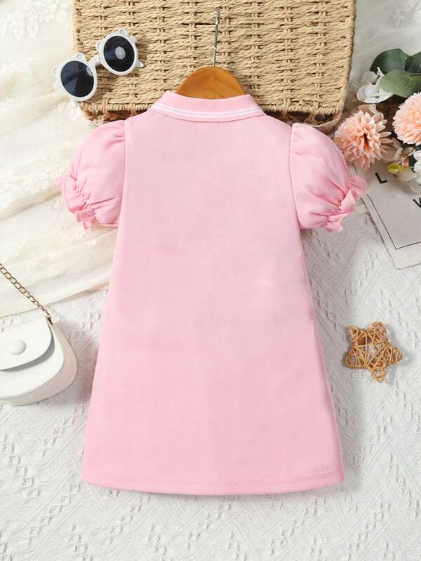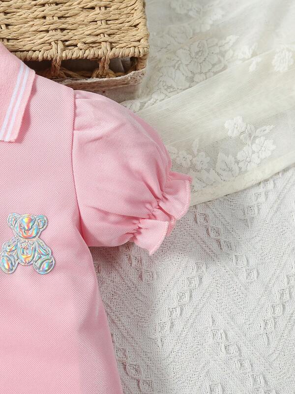 SHEIN Baby Girl Bear Patched Puff Sleeve Polo Neck Dress