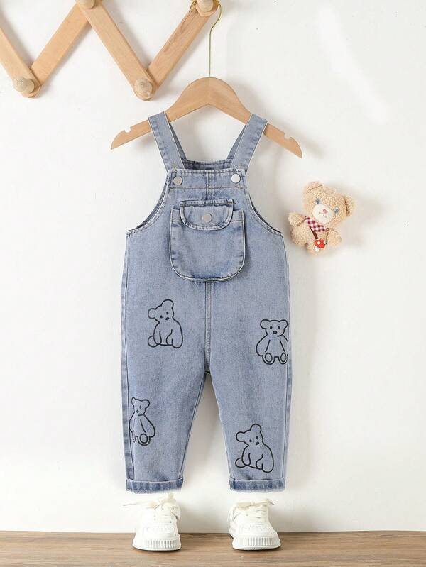 Baby Girl Bear Print Flap Pocket Denim Overalls