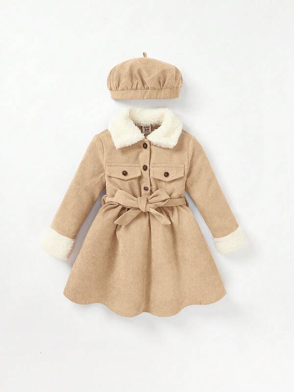 Cozy Cub Baby Girl Borg Collar Flap Detail Belted Dress & Hat