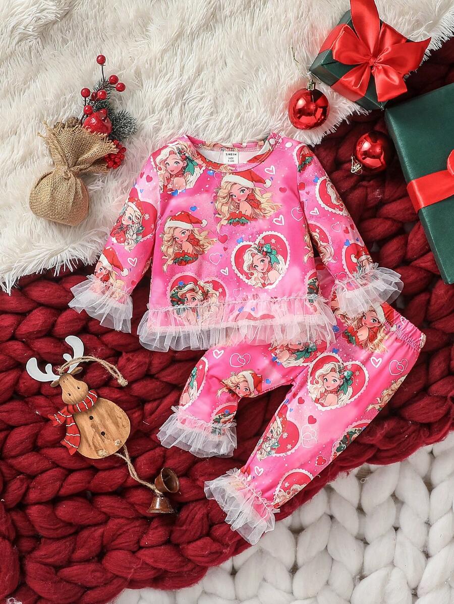 Baby Girl Cartoon Figure Graphic Contrast Mesh Ruffle Trim Tee & Pants