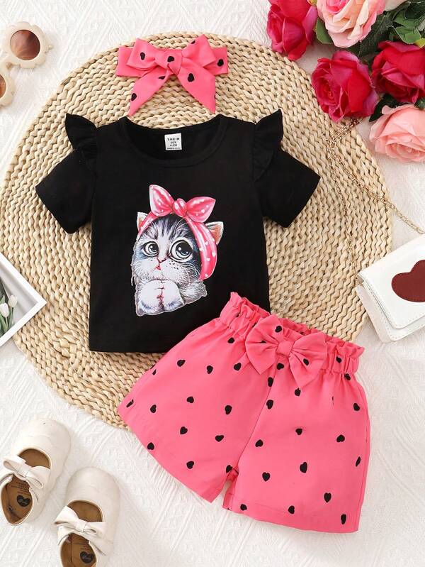 Baby Girl Cartoon Graphic Ruffle Trim Tee & Heart Print Bow Front Shorts & Headband