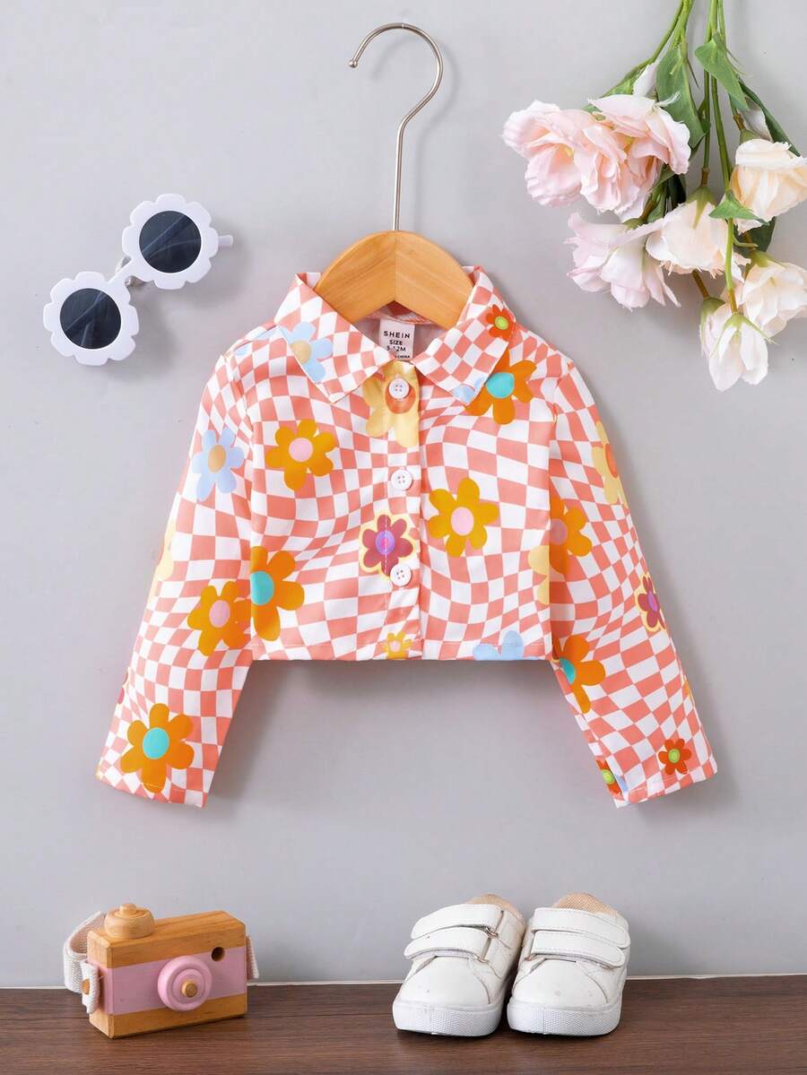 Baby Girl Checker & Floral Print Button Front Crop Shirt