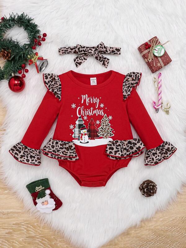 SHEIN Baby Girl Christmas Print Ruffle Trim Bodysuit & Headband