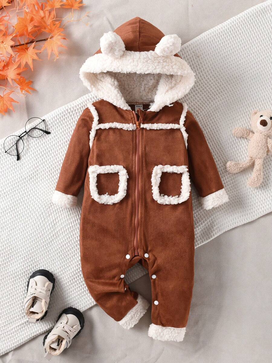 Baby Girl Contrast Binding Zipper Front 3D Ears Design Hooded Teddy Lined Zip Up Dual Pocket Jumpsuit