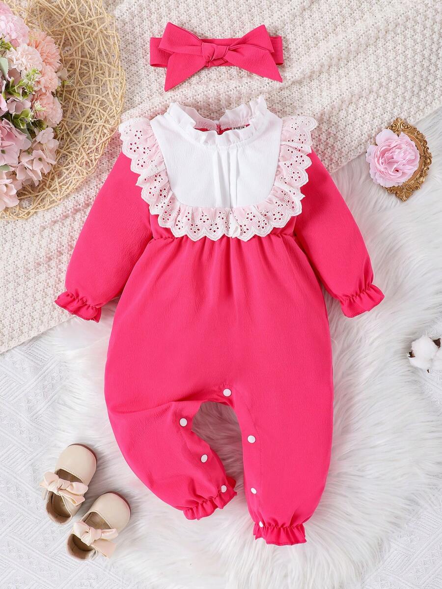Baby Girl Contrast Eyelet Embroidery Ruffle Trim Flounce Sleeve Jumpsuit & Headband