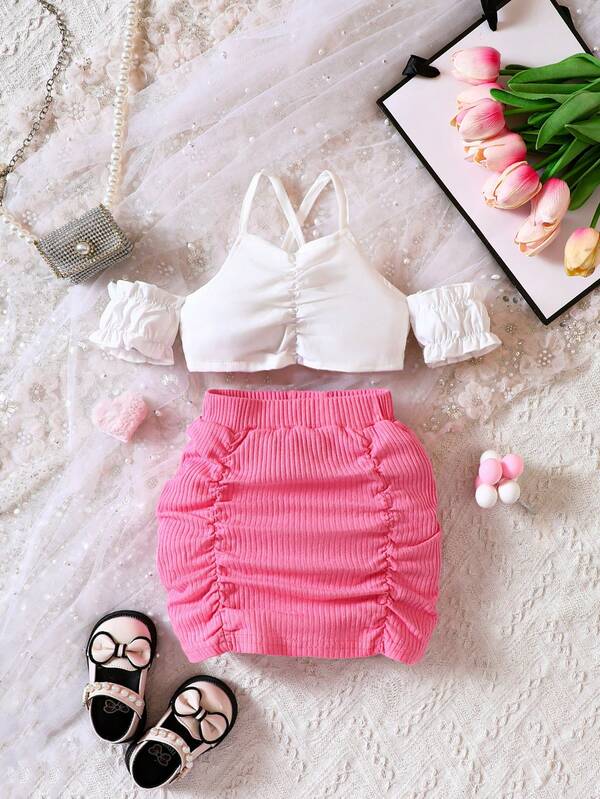 Baby Girl Crisscross Cold Shoulder Crop Top & Ruched Skirt