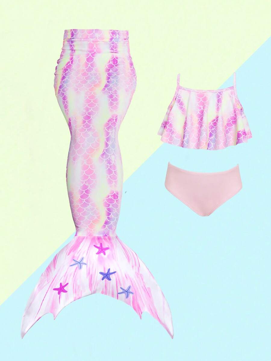 Baby Girl Fish Scales Print Bikini Swimsuit & Mermaid Tail Skirt