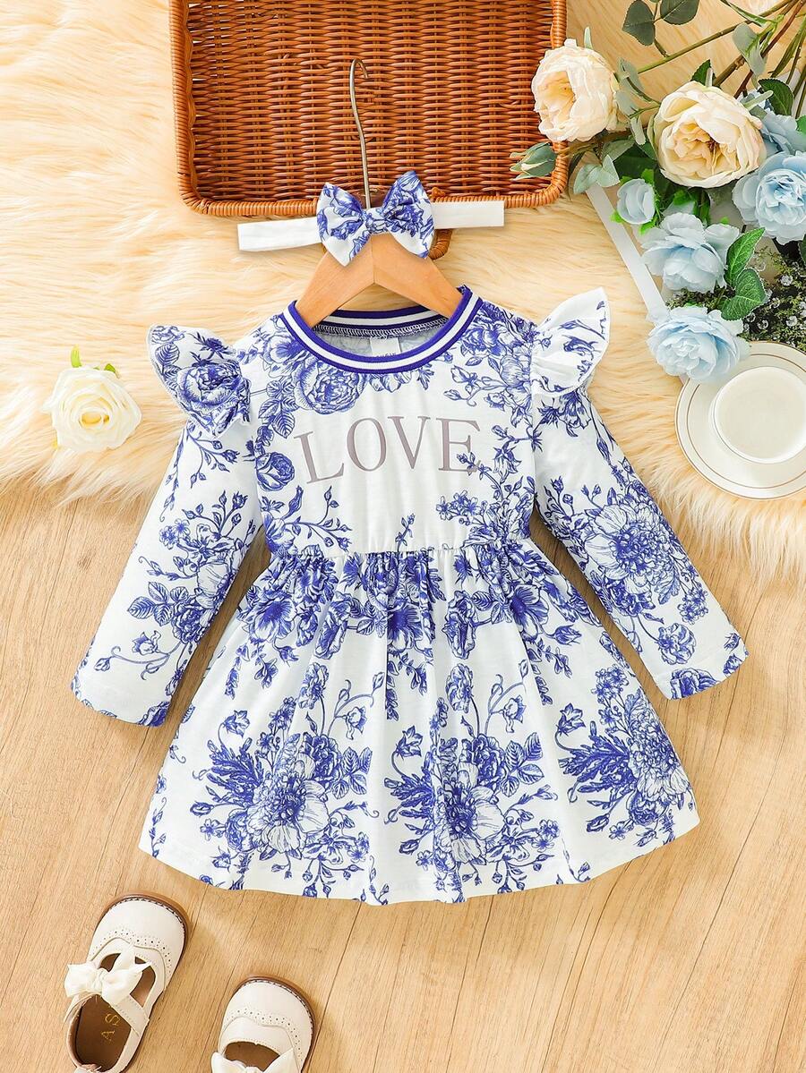 SHEIN Baby Girl Floral & Letter Print Ruffle Trim Dress & Headband