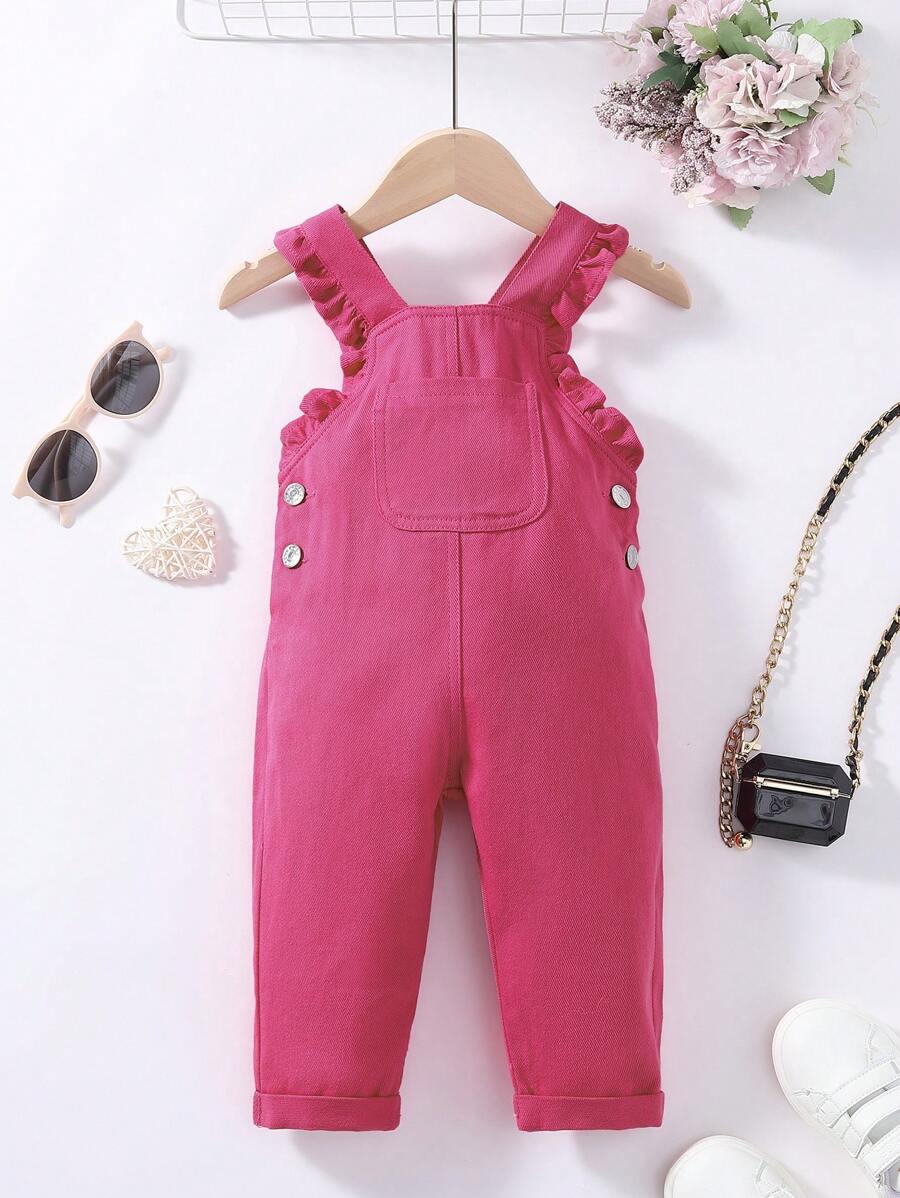 Baby Girl Frill Trim Pocket Patched Denim Overalls