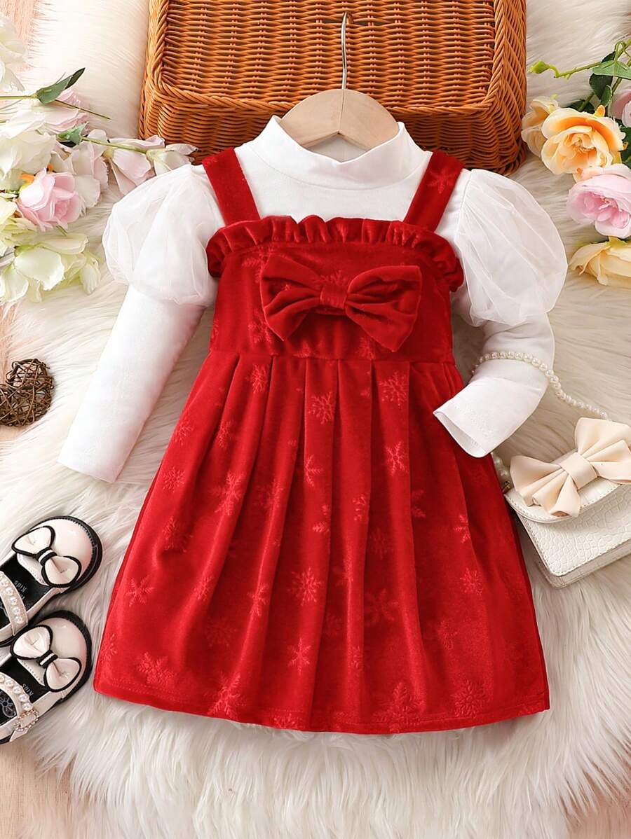 SHEIN Baby Girl Gigot Sleeve Tee & Bow Front Frill Trim Dress for Christmas