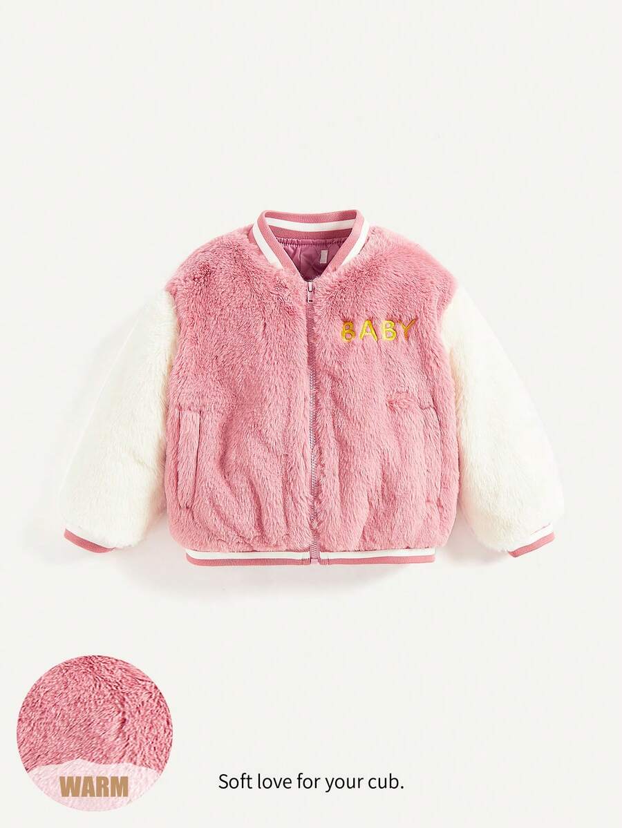 Cozy Cub Baby Girl Letter Embroidery Colorblock Striped Trim Fleece Bomber Jacket