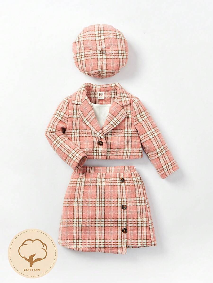 Cozy Cub Baby Girl Plaid Print Lapel Neck Blazer & Skirt & Cami Top & Hat