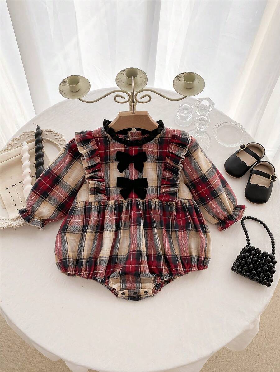 Baby Girl Plaid Print Ruffle Trim Bow Front Flounce Sleeve Bodysuit
