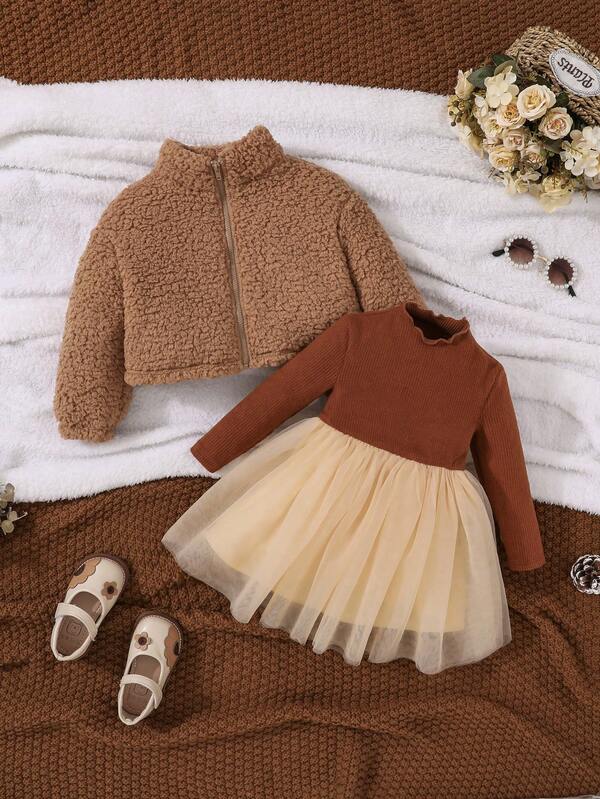 SHEIN Baby Girl Zip Up Jacket & Mesh Overlay Dress