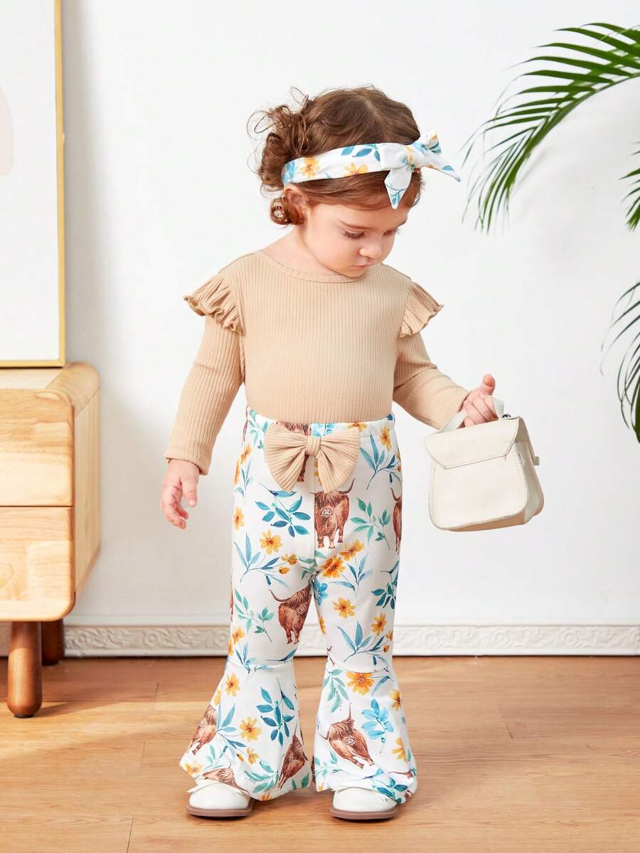 SHEIN Baby Girls' Animal & Floral Print T-shirt And Bell-bottoms Set