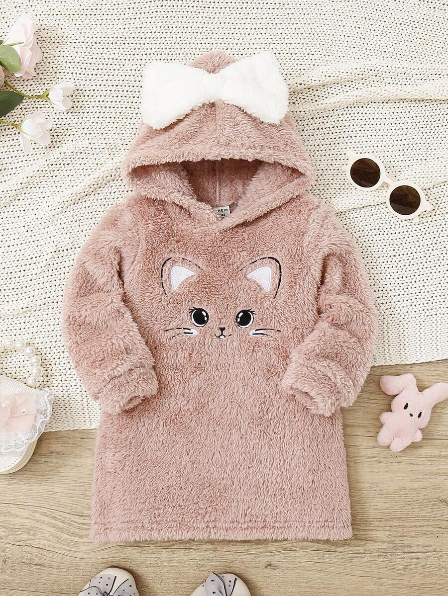 SHEIN Baby Girls' Casual Cat Embroidery Hooded Dress With Fleece Lining