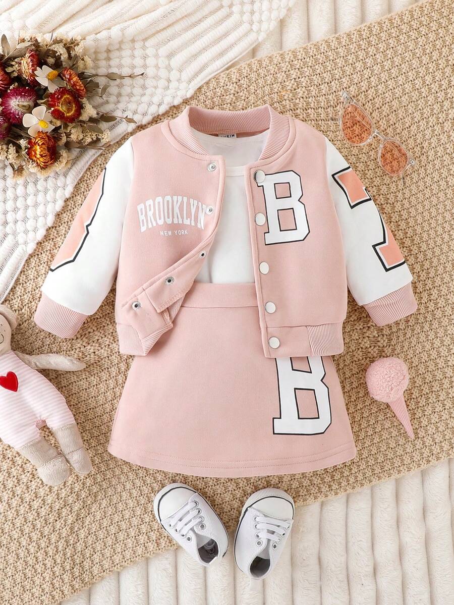 Baby Girls' Casual Sports Baseball Jacket And Skirt Set For Spring And Autumn