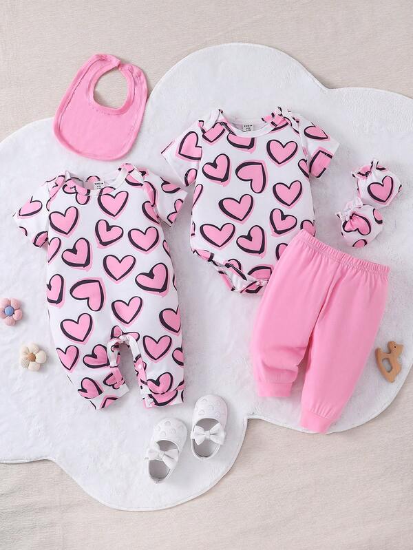 SHEIN Baby Girl Cute & Fun Pink Heart Print & Daily Wear Gift Set For Spring & Summer