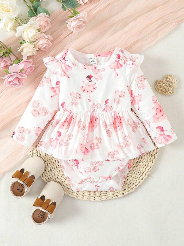 Baby Girls' Cute Romantic Flower Ballet Dancer Printed Bodysuit For Autumn/Winter