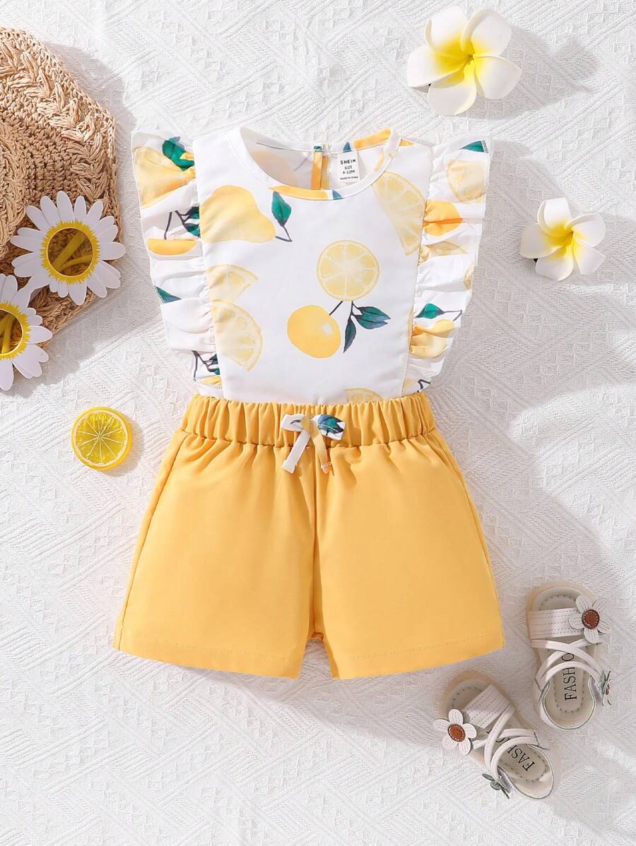 Baby Girls' Lemon Print Ruffle Trim Top And Shorts Set