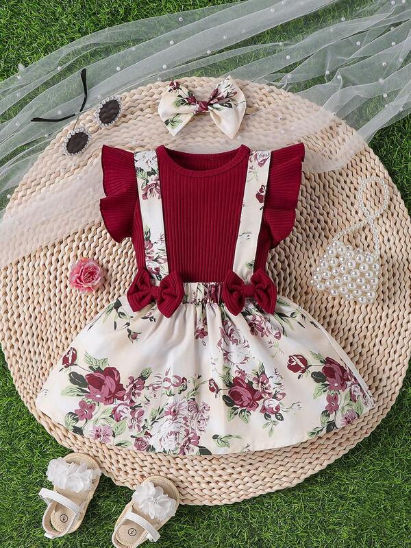 Baby Girls' Ribbed Ruffle Trim Top With Floral Print Bowknot Overall Dress Set