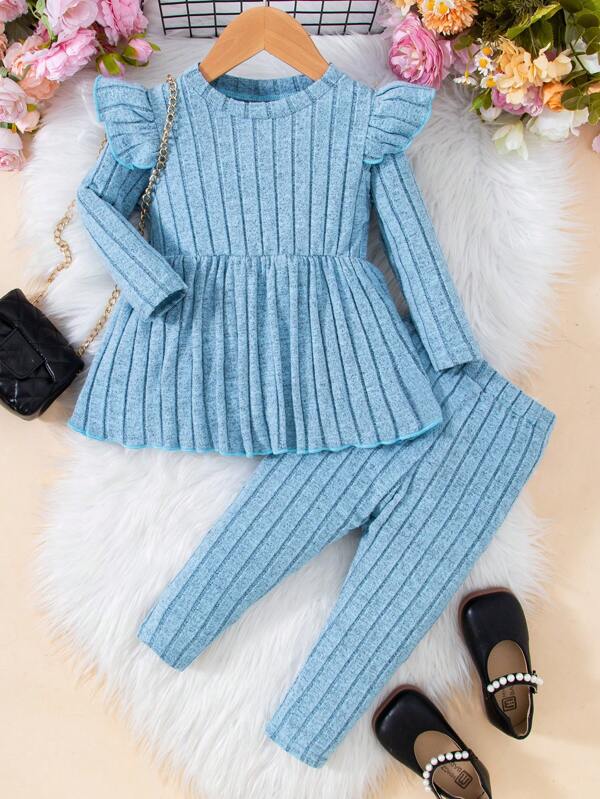 Baby Girl Round Neck Ruffle Trim Long Sleeve T-Shirt And Pants Set, Solid Color Comfortable 2pcs
