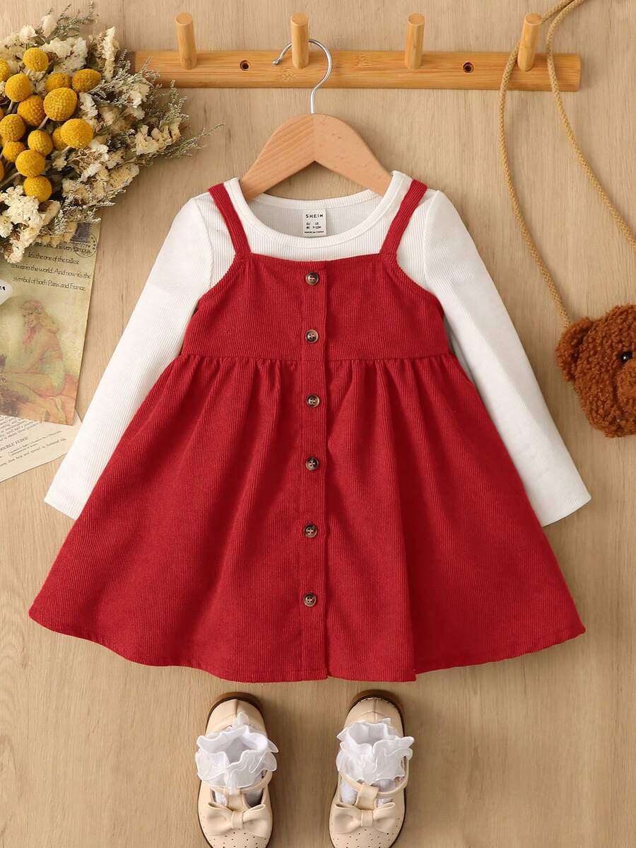 SHEIN Baby Girls Button Front Corduroy Cami Dress Without Tee