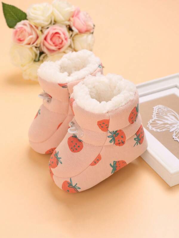Baby Girls Strawberry Print Thermal Lined Fabric Drawstring Design Cute Snow Boots For Winter