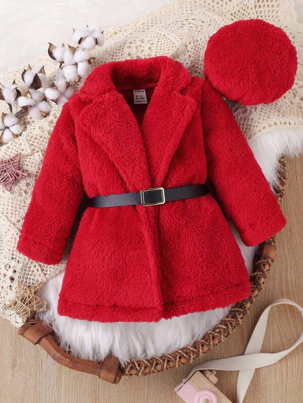 Baby Lapel Neck Belted Teddy Coat & Hat