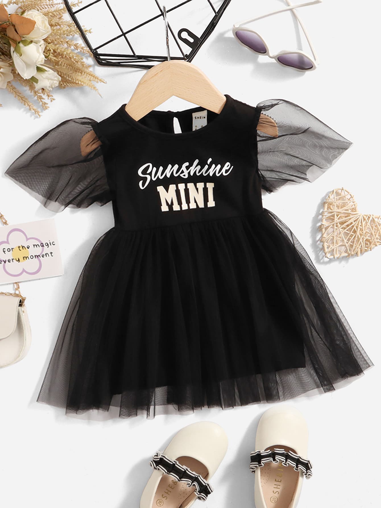 SHEIN Baby Letter Graphic Puff Sleeve Contrast Mesh Dress