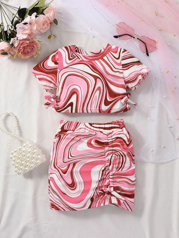 Baby Marble Print Bow Side Tee & Ruched Skirt