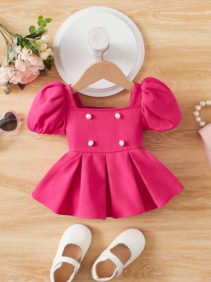 SHEIN Baby Puff Sleeve Fold Pleated Detail Peplum Top