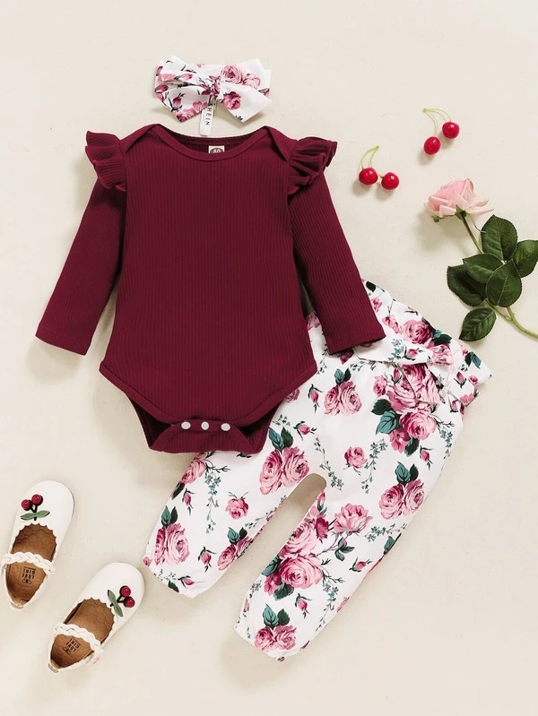 Baby Ruffle Trim 1 Bodysuit & Floral 1 Pants & 1 Headband