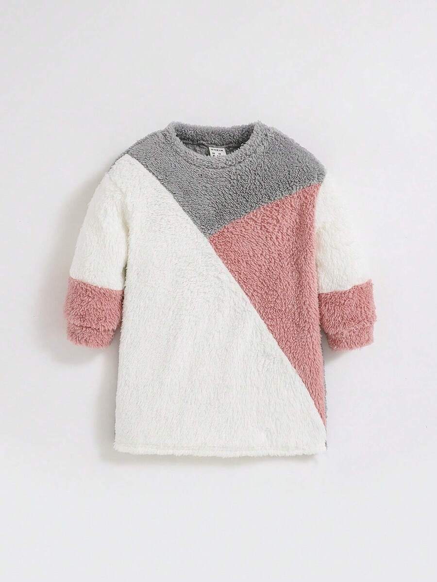 SHEIN Babygirl Casual Color Block Plush Round Neck Long Sleeve Dress