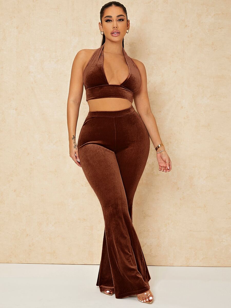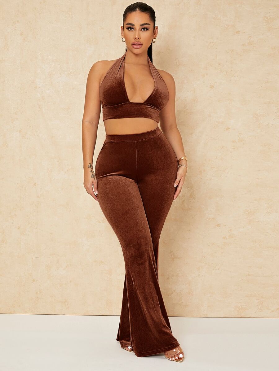 SHEIN SXY Backless Crop Velvet Halter Top & Flare Leg Pants
