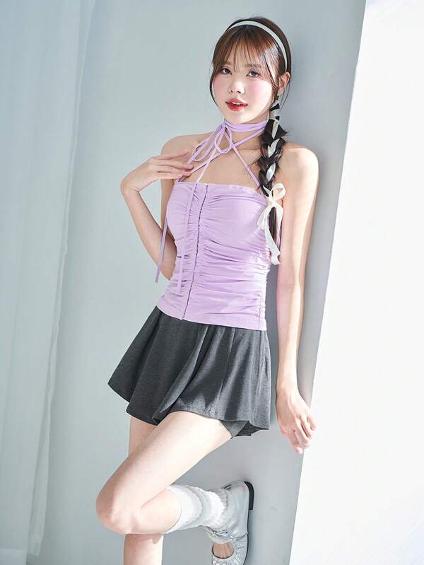 SHEINNeu Balletcore Bow Ruched Halter Neck Lace-Up Tube Top Valentines Clothes Summer Tops