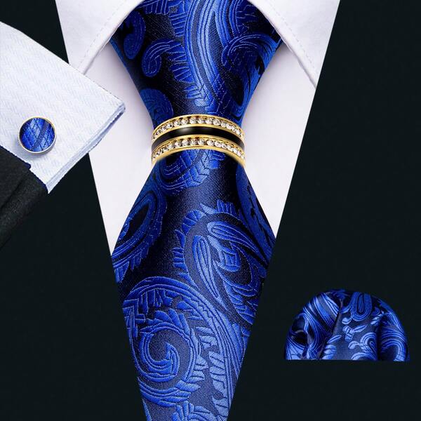 Barry Wang Paisley Blue Silk Classic Tie Hanky Cufflink Square Set Necktie
