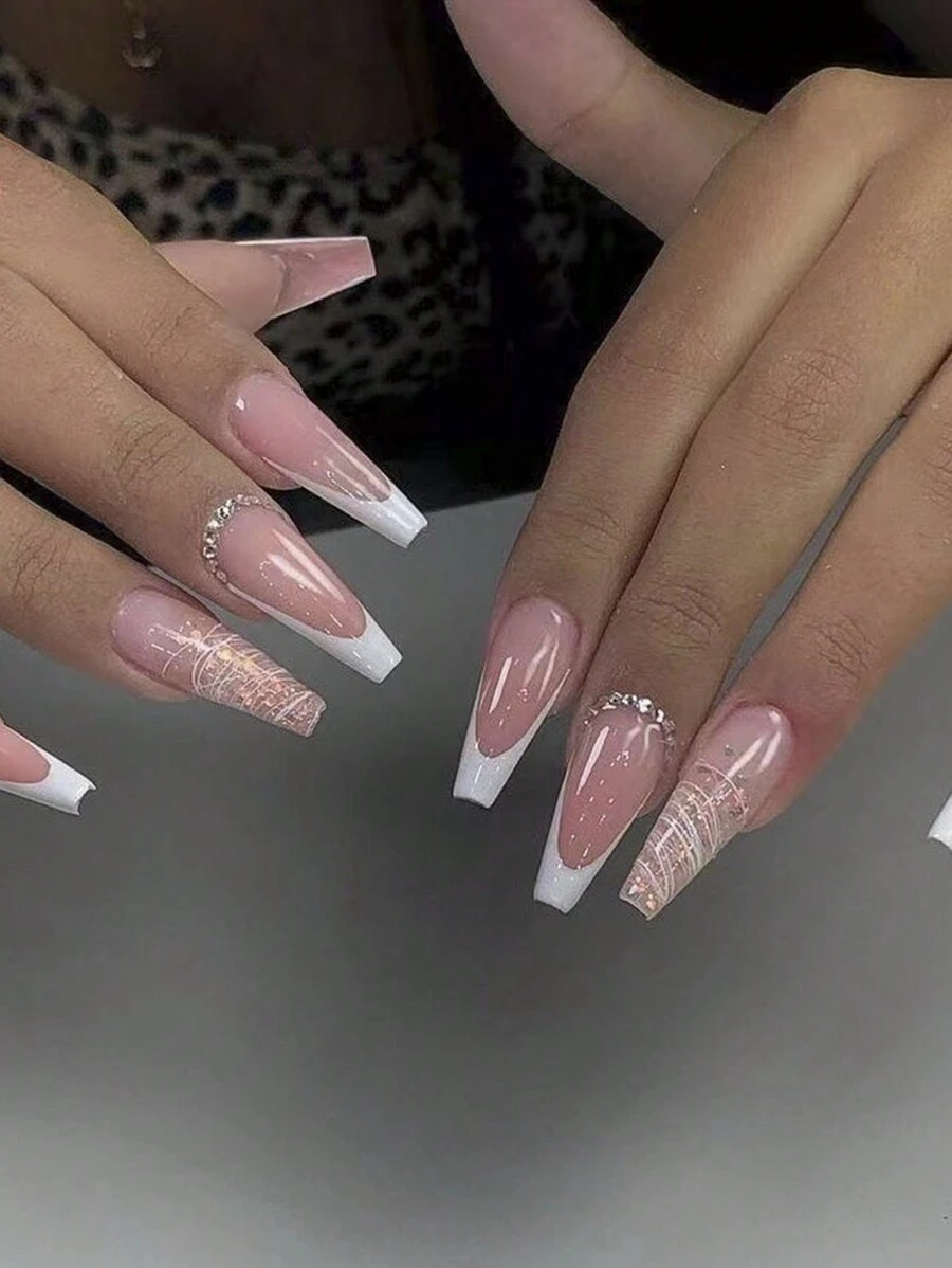 Beautify Your Look With 24 Pieces Of Long Ballet Nails, French White Edge, White Multi-Color Stripes, Simple Style Wearable Manicure, Nail Clips And Reusable Nail Set, Suitable For Daily Holiday Wear