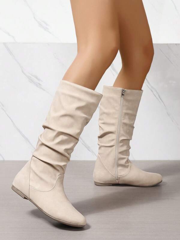 Beige Fashionable Knee-High Boots For Women, Comfortable Flat Heel With Side Zipper Closure