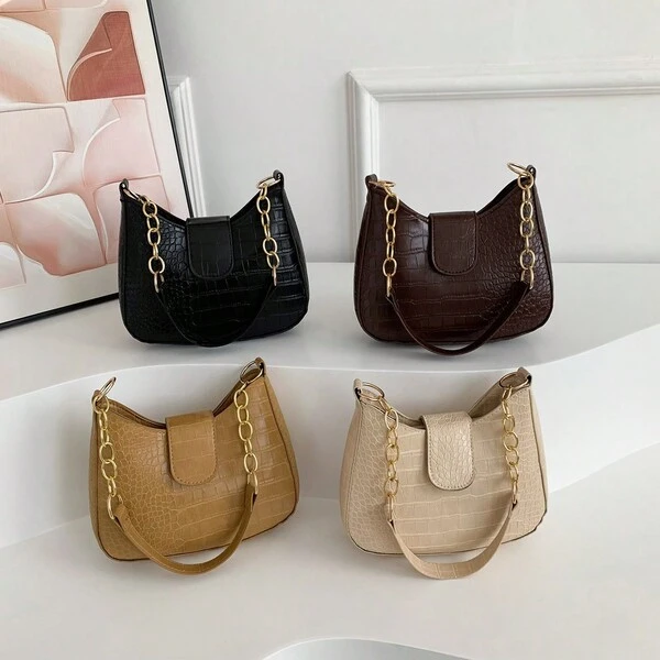 Beige Pu Elegant Minimalist Crocodile Pattern Shoulder Bag With Big Capacity, Metal Chain Decoration And Buckle Closure. For Women'S Daily Commute, Shopping, Travel, Holiday, Parties, Cosmetics Storage And As Gifts For Girlfriend Or Female Friends On Festivals Or Birthdays. Popular Fashion Item For Trendy And Stylish Personae.